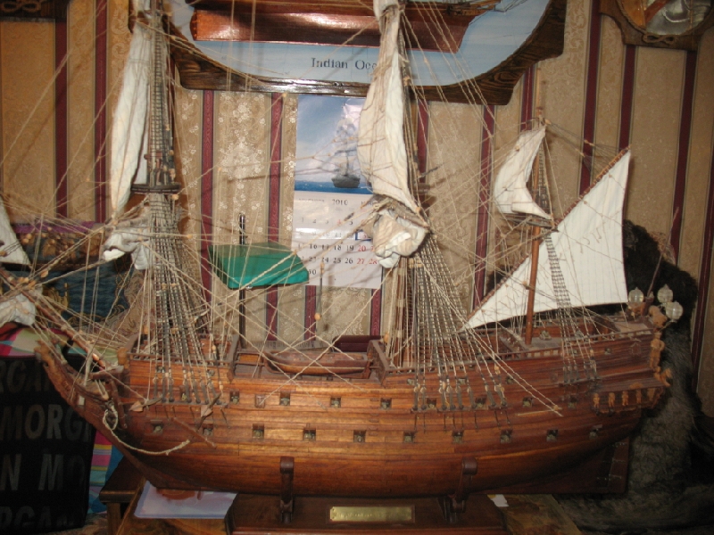 Однажды на судне был конкурс на лучший кораблик. Дедушка Серёжа занял первое место. Он сделал парусник из кокосовой скорлупы. Потом дедушку каким-то образом занесло в Африку за бананами и ананасами. Он побывал во многих странах, даже сейчас столько не объездишь. В каждом порту покупал открытки. Теперь, глядя на них, он может рассказать о каждой своей поездке. Мне нравится в доме у деда Серёжи, потому что квартира его в Рыбинске, как морской кубрик. Вместо люстры — штурвал, на шкафу серия барельефных кораблей «Развитие пароходства», портреты из дерева, стол — в виде древнейшей карты, сделан пиратский сундучок, и не пустой. Там лежат памятные вещи.