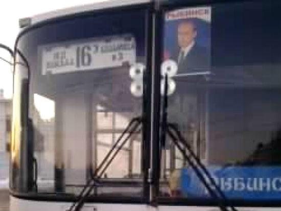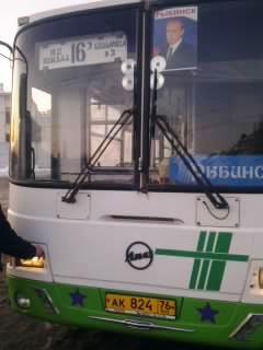 Плакаты с Путиным ездят на лобовом стекле и в салонах автобусов маршрутов № 4, 6, 12 и маршрутных такси № 16Т. Это то, что успел заметить депутат Ярославской областной Думы Михаил Парамонов, о чем и написал заявления в Рыбинскую городскую прокуратуру, Волжскую и Пролетарскую ТИК.