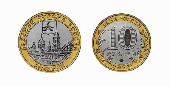 Монета номиналом 10 рублей вышла в серии «Древние города России». На реверсе монеты — архитектурные символы Рыбинска — Волжский мост и Спасо-Преображенский Собор.
