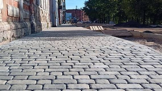 Каменной брусчаткой вымощен тротуар. В ближайшие дни подрядчику предстоит подготовить к укладке плитки и дорожное полотно. Основным элементом покрытия станет галтованный гранит — его уложат веером по центральной части улицы.
